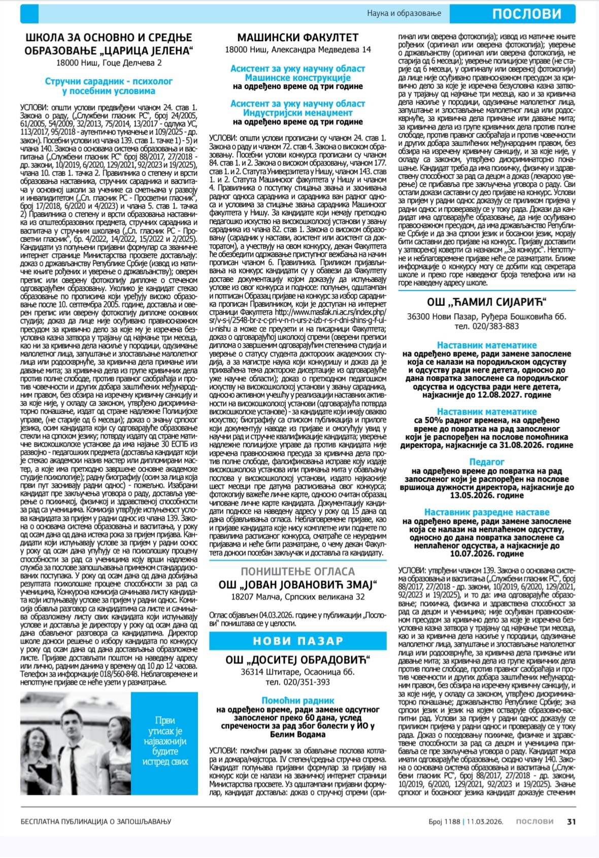 Конкурс за избор у звање и заснивање радног односа за два сарадника у звање асистент. Објављен 11.3.2026. Конкурс